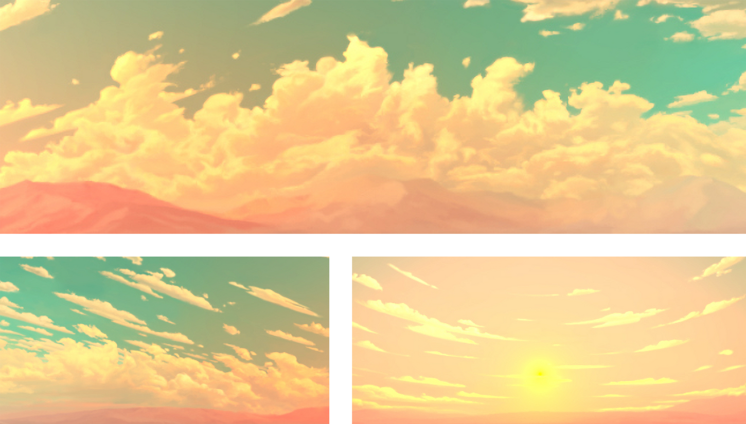 I Matte-Painted these skyboxes using Terragen, Modo, Unreal 4, 360 Skybox photos and of course, Photoshop. I experimented with each skybox I made, learning from my mistakes and finding new ways to stylize clouds.